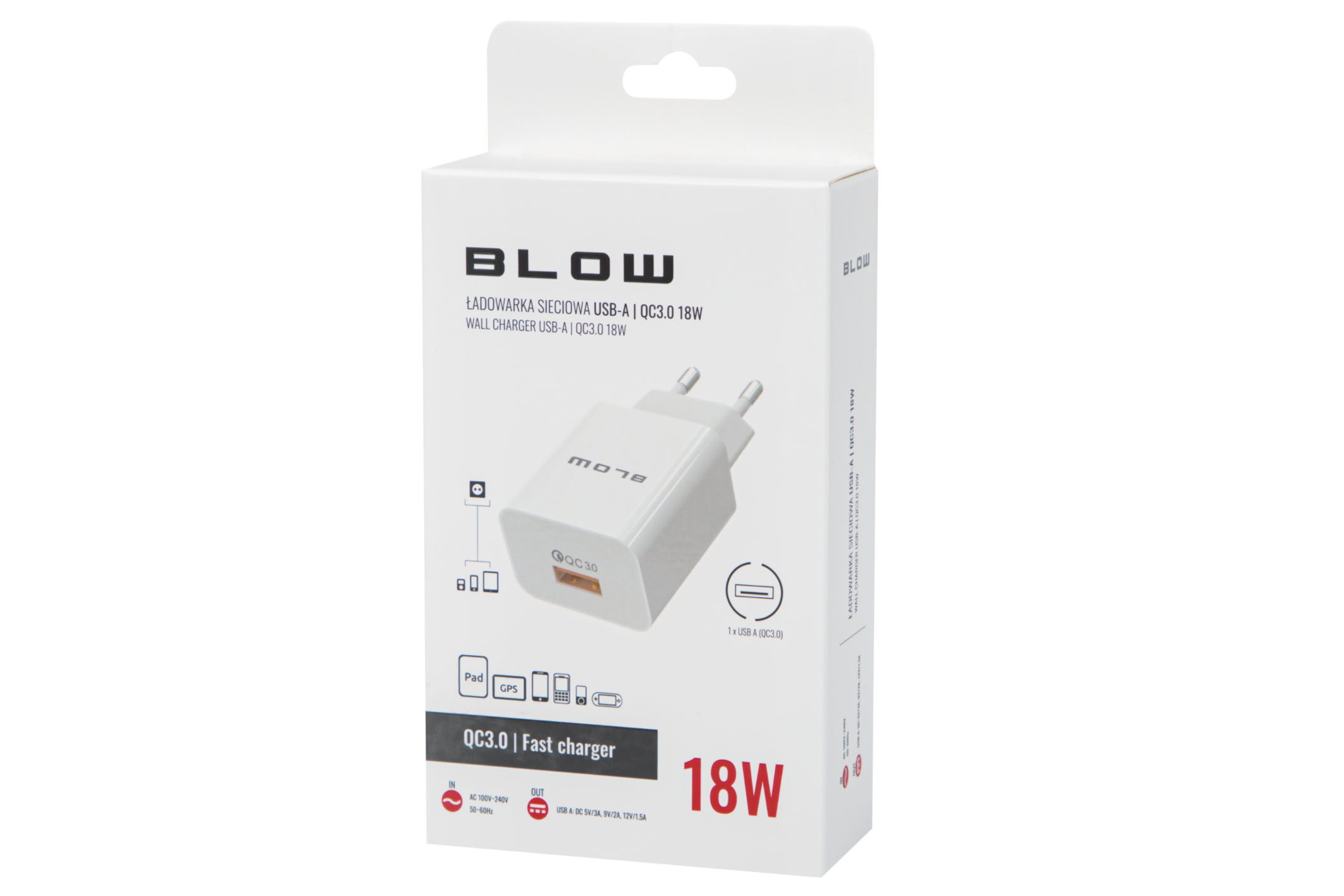 Ładowarka sieciowa BLOW QC 3.0 18W to nowoczesne i wydajne urządzenie przeznaczone do szybkiego ładowania smartfonów, tabletów, powerbanków, kamer oraz innych urządzeń mobilnych. Dzięki technologii Qualcomm Quick Charge 3.0, ładowarka automatycznie dopasowuje napięcie i natężenie prądu do podłączonego sprzętu, zapewniając nawet do 4 razy szybsze ładowanie niż standardowe zasilacze.